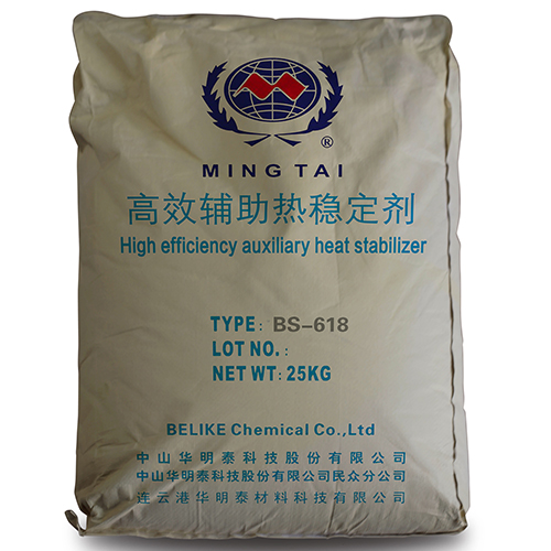 高效热稳定辅助剂BS-618是一种通过特定条件合成而得的辅助热稳定剂,白度高、粒径小比表面积大、分散性好的特点。因此具备了高效的吸附性、耐酸、耐热等性能,用于PVC制品加工中能吸附大量氯化氢,减少PVC在热和剪切下释放氯化氢,同时会络合加工过程中释放出的烯丙基氯,因此具备很好的热稳定作用。用于复合铅盐稳定剂中,替代三、二盐,与硬脂酸铅等具有优良的协同稳定作用,体现优良的热稳定性、初期着色性,并能吸收紫外线而提高户外用制品的耐候性能。应用中加工性保持不变,扭矩更佳平稳,等量替代10%左右铅盐(以氧化铅计,如三、二盐,或其他含铅单体稳定剂)的前提下热稳定性保持不变或略有提高;本品也可用于其他稳定体系。使用本品后可不用三盐、二盐,或用量控制在5%以内即可满足热稳定要求。添加本品10-15%后的铅盐稳定剂,铅含量可调到12-15%,其热稳定性能能与铅含量25-32%的稳定剂相当,并且具有更好的初期着色和表面光亮性;同时建议,将部分硬脂酸铅以硬脂酸锌替代效果更佳。